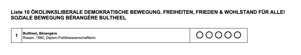 Das Kennwort ÖLDP lautet: ÖKOLINKSLIBERALE DEMOKRATISCHE BEWEGUNG: SOZIALE POLITIK, FRIEDEN & WOHLSTAND FÜR ALLE! BULTHEEL ÖLDP WÄHLEN.